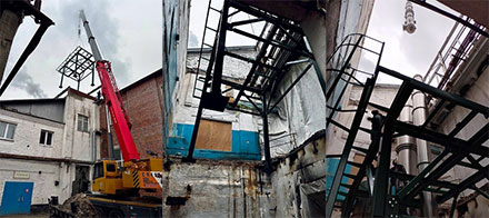 Монтаж установки проводился через разобранную кровлю в имеющееся здание, откуда ранее было демонтировано другое оборудование.